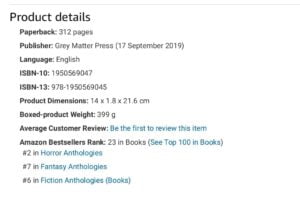 I watched the rank increase. It went up to #57 in the overall store, but still #2 in Horror Anthologies. Come on, I thought. I must be close. Then it got to #36 in the overall store, then #27, then #23. Holy crap! An amazing result. But still #2 in Horror Anthologies: