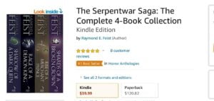 That day I beat out actual horror short story collections by Stephen King and H P Lovecraft (holy shit, right?) but I can’t beat a box set of Feist novels. Here it is, with that orange #1 Bestseller badge that could have helped me out so much:
